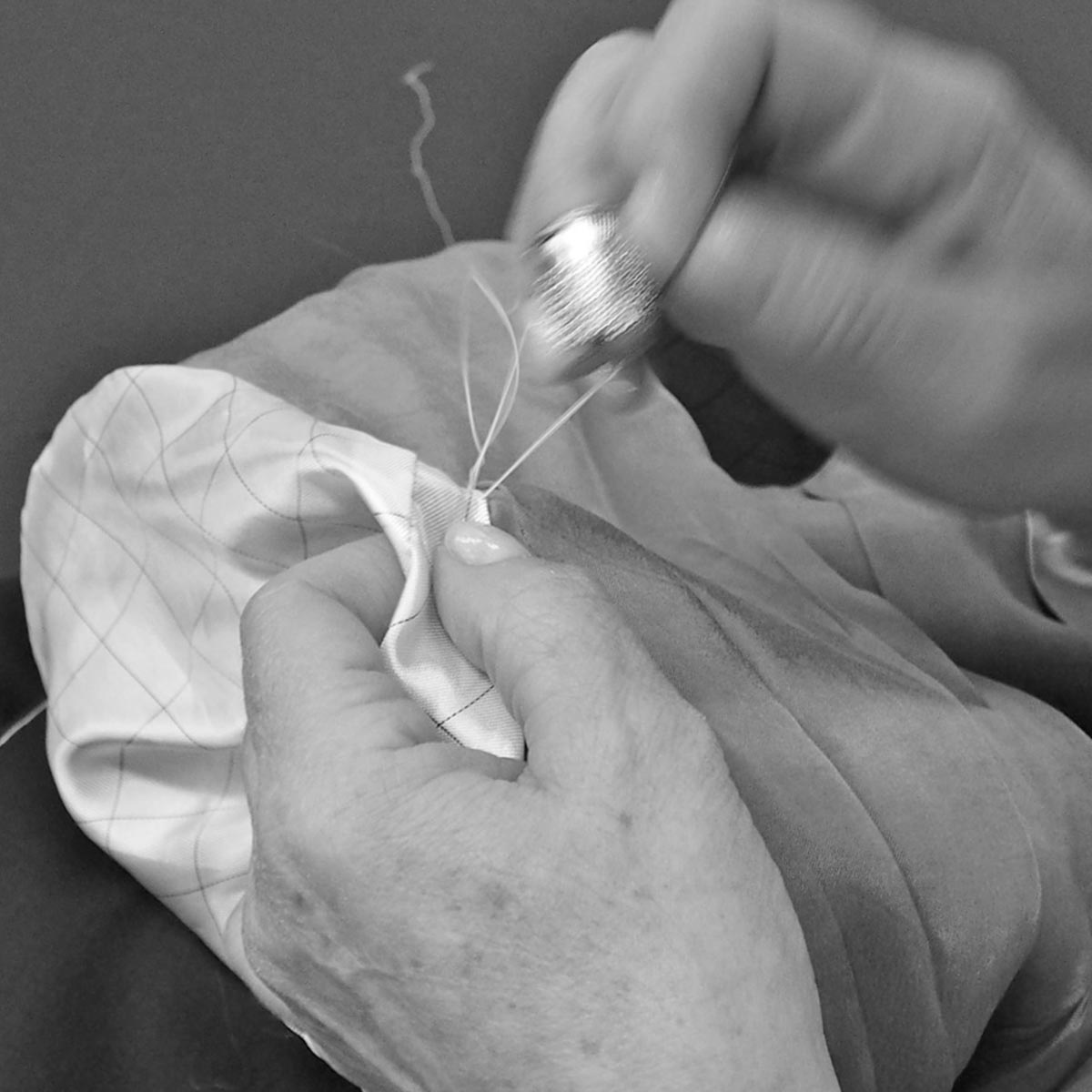 It takes 345 minutes of work to make a Tailored Suit jacket, twice that of a standard style. The refined fabrics, the canvas on the inside, the 130 hand-sewn stitches on the armhole, and the careful pressing make it unique for the natural way in which it moulds to the many different female physiques.