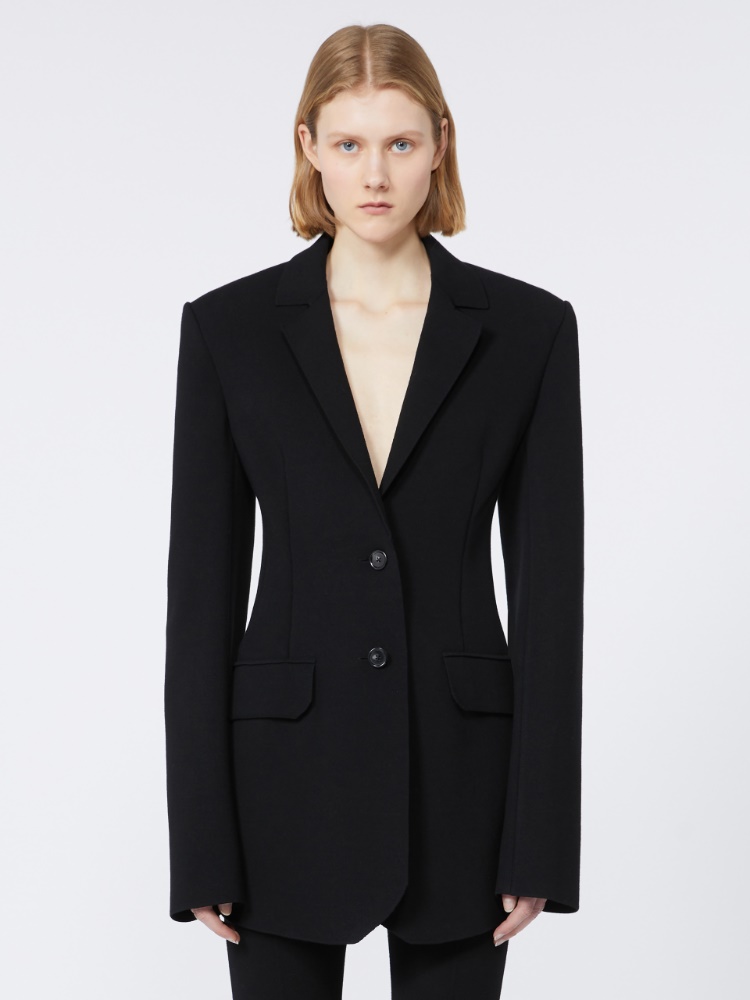 Feminine blazer with structured shoulders and a waistline highlighted by darts on the torso. Slightly long on the hips, it outlines a graphic silhouette, with clean shapes interpreted by the flexible stretch viscose knit.